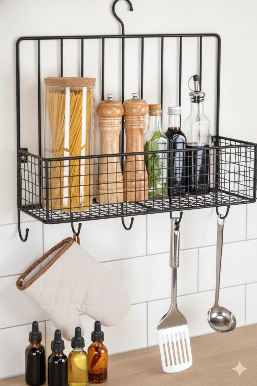 Metal Spice Rack with 5 Utensil Hooks, Standard, Black