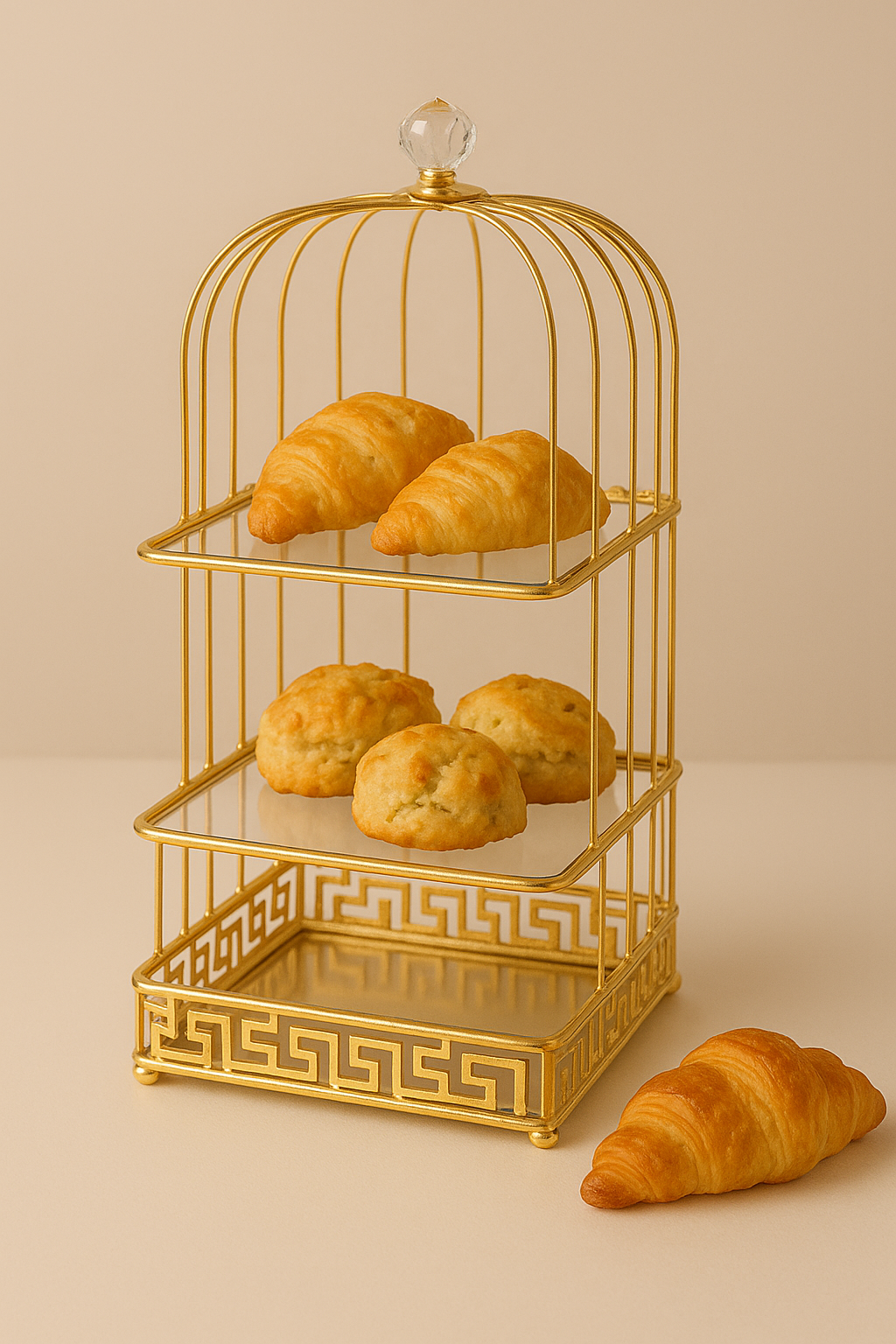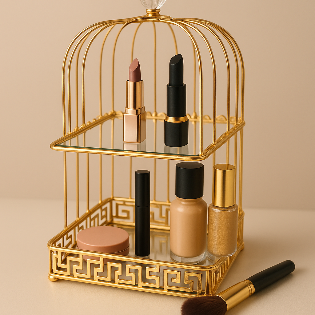 Add a touch of sophistication to your vanity with this Luxury Golden Birdcage Makeup Organizer. Crafted from premium metal with a radiant gold finish, this two-tier organizer combines elegance and functionality. The mirrored glass shelves provide a luxurious display space for lipsticks, foundations, perfumes, or jewelry, while the intricate geometric detailing enhances its decorative charm.