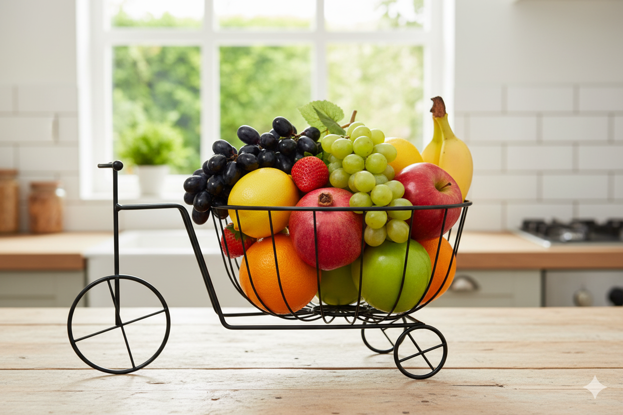 • Add a creative touch to your home with this stylish bicycle-shaped fruit basket. Made from strong black metal, it’s perfect for displaying fruits like bananas, grapes, lemons, and more. Great for kitchen decor, dining tables, or gifting.