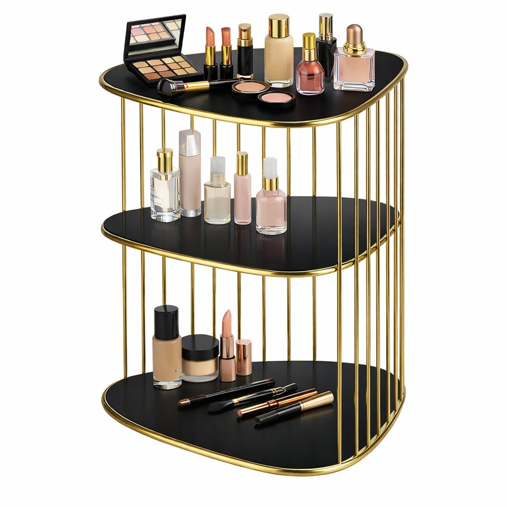 Keep your beauty essentials neat and stylish with this 3-tier makeup organizer shelf. Designed with a premium gold metal frame and elegant black shelves, it provides ample space for storing makeup, skincare products, perfumes, brushes, lipsticks, and foundations. Its modern and space-saving design makes it perfect for your dressing table, vanity, or bathroom countertop.
